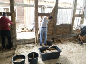 Die Abrissarbeiten verliefen im Frühjahr zügig. Mit einem Minibagger hoben wir den alten Boden heraus, um neuen Estrich gießen zu können. Auch die Innenwände stehen schon, sie sind mit großen Tonziegeln gemauert. Das marode Dach, das uns große Sorgen bereitete, haben unsere Handwerker*innen inzwischen mit neuen Balken verstärkt.