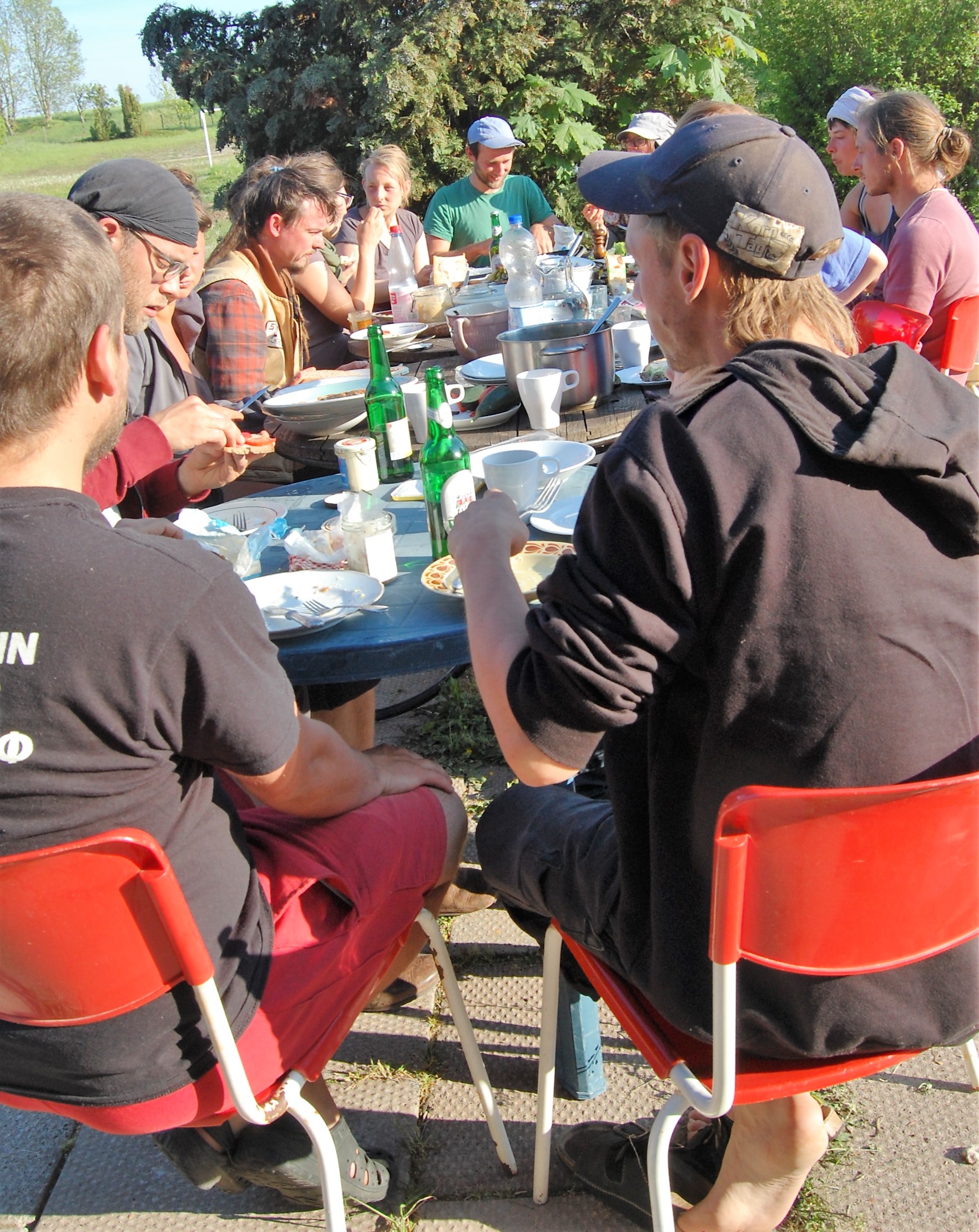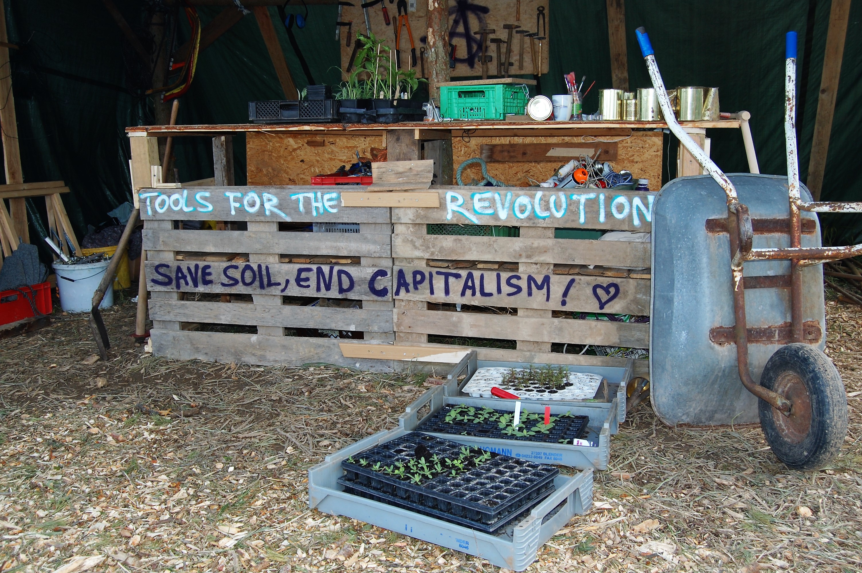 Auch die Besetzer*innen vom Acker in Eichenberg, mit denen sich einige von uns verbunden fühlen, leben dieses freie Geben und Nehmen, sie haben im Frühjahr überschüssige Jungpflanzen von einigen Gärtnereien geschenkt bekommen und diese angebaut. Jetzt ernten sie im Überfluss und haben das Gemüse auf dem Marktplatz in Witzenhausen verteilt. Sie erhalten wiederum von den Anwohner*innen in Neu-Eichenberg vieles, was sie auf dem Camp gebrauchen können, oftmals in Dankbarkeit, dass sie Protest gegen das völlig irrsinnige Riesen-Logistikgebiet täglich leben.