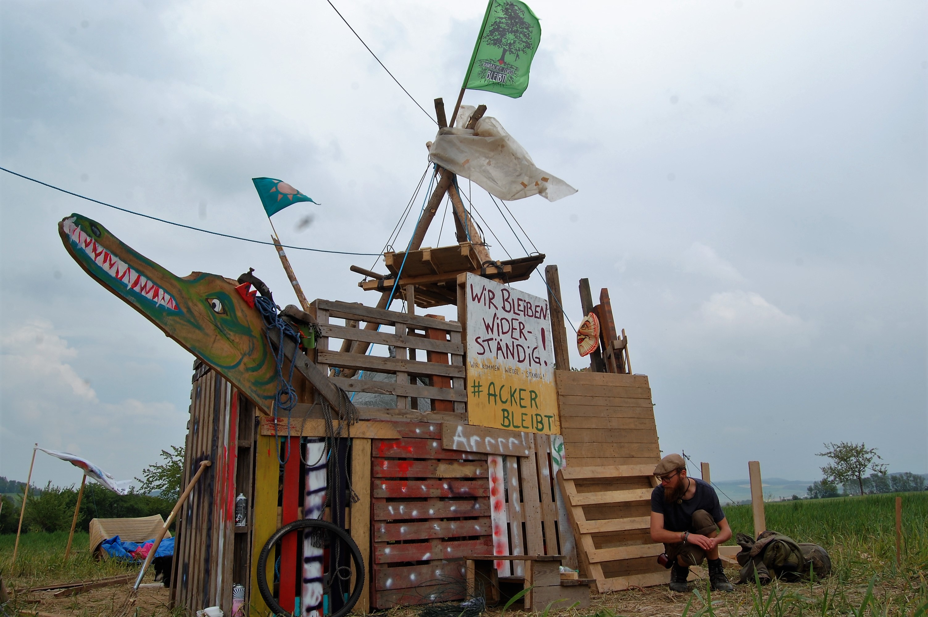 Die Besetzer*innen vom Acker in Neu-Eichenberg rüsten sich gerade für den Winter. Das Camp ist in den vergangenen Monaten zum zentralen Ort des Protestes gegen das geplante Logistikgebiet am Dorfrand von Hebenshausen geworden. Die Gemeinde und das Land Hessen erwägen dort, eine Fläche von 80 Hektar zu verkaufen, damit dort Hallen für Online- und Versandthändler entschehen können. Ende August teilte die Dietz AG als mögliche Investorin der Gemeinde mit, kein Interesse mehr an dem Gelände zu haben. In einem Brief vom 28. August heißt es: