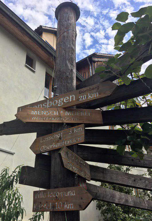 Wir stehen jetzt auch auf dem Wegweiser der Kommune Niederkaufungen, zusammen mit den anderen Interkomm-Gemeinschaften. Die Gemeinschaft am östlichen Kasseler Stadtrand ist mit rund 80 Bewohner*innen die größte Kommune in der Region. Sie gibt es bereits seit 1986 und versteht sich als lebendiges Experiment eines alternativen Lebensstils – wie wir auch. Uns verbindet, dass auch wir ohne Hierarchien solidarischer und ökologisch nachhaltiger miteinander leben und arbeiten wollen.