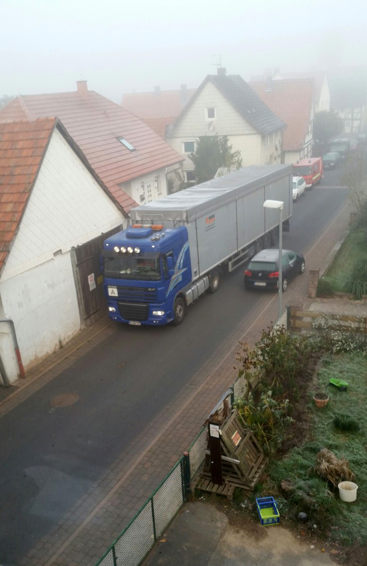 Es ist ja nur eine kleine Dorfstraße, an der unser Hof liegt. Doch von Lastwagenfahrern rege genutzt, weil es eine Abkürzung ist, wenn sie von Hann. Münden kommend nach Eschwege fahren. Vermutlich wird ihr Navi ihnen die Route anzeigen. Würden sie nämlich die schmale Straße kennen, durch die sich ihr 40-Tonner schiebt, nähmen sie gewiss den Weg über die Bundesstraße. Die Ersparnis ist nur minimal, und der Weg durch die schmale Straße alles andere als ein Genuss. Nun fahren am Tag nicht nur drei oder vier Lastwagen die Ludwigsteinstraße entlang, sondern rund zwei Dutzend oder noch mehr, wie eine Messung der landeseigenen Firma „Hessen Mobil“ ergeben hat.